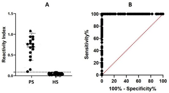 Reactivity of rat infected sera (PS, n = 16) and healthy rat sera (HS, n = 25) with synthetic specific spanning epitope PsAg2-MAP4 in an ELISA. (A) The y-axis shows sera’s mean reactivity (positive/mean negative) from infected rats. The ROC analysis (B) using PS showed that the sensitivity and specificity of the in-house ELISA-peptide was 100% for PsAg2. The dashed line shows the cut-off of the assay.