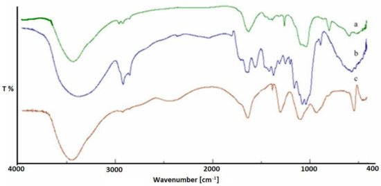 FTIR of β-glucans–chitosan ester (a), β-glucans mixture (b), and carboxylated β-glucans mixture (c).