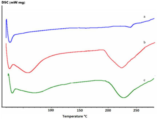 Initially, the mixture of β-D-glucans (β-1,3 and β-1,6) was subjected to a carboxylation reaction and subsequently characterized. Quantitative analysis of carboxyl groups [32,33] revealed a content of 0.430 mmol per 50 mg of β-glucans mixture. From the FTIR spectrum (Figure 1), the presence of a new band at 1715 cm−1 due to the stretching vibration of the C=O of the acid was revealed. After carboxylation, the β-glucan mixture was esterified with chitosan and characterized by FTIR and DSC. From the data obtained, the presence of a new band at 1725 cm−1 can be attributed to the C=O stretching vibration of the ester group. For further confirmation of esterification, quantitative analysis of the ester groups was performed by determining, by volumetric analysis, the degree of substitution (DS), which was found to be 0.820. DSC curves of the β-glucans mixture (curve c), the carboxylated β-glucans mixture (curve b), and β-glucans–chitosan (curve a) are shown in Figure 2, indicating an endothermic peak at 228, 225, and 242 °C, respectively. The shift at a higher temperature of the latter peak further confirms the formation of ester bond between β-glucans and chitosan.