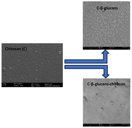 SEM images of surfaces of chitosan (C), C-β-glucans, and C-β-glucans–chitosan membranes.