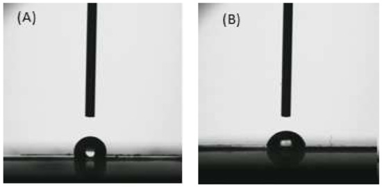 Images of water drop on C-β-glucans (A) and C-β-glucans–chitosan (B) membranes.