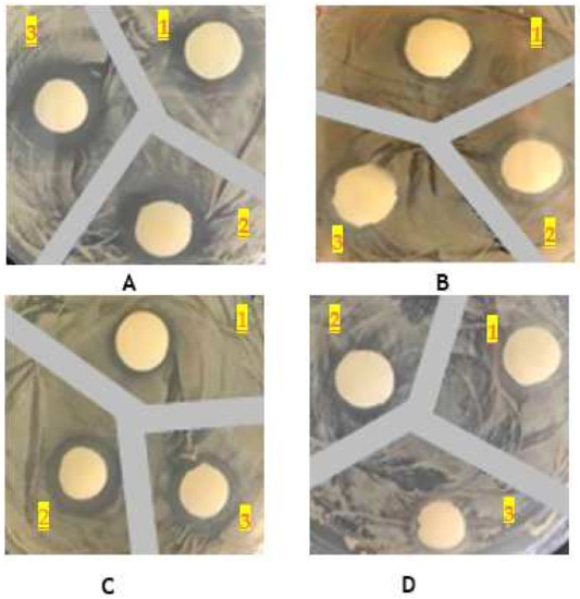 Inhibition zones against Klebsiella pneumoniae (A); Escherichia coli (B); Pseudomonas aeruginosa (C); Staphylococcus aureus (D) of membranes containing only chitosan (1), β-glucans–chitosan (2) and only carboxylated β-glucans (3).