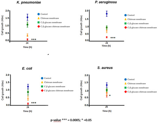 Moreover, the sensitivity of bacteria to the different polysaccharides was also confirmed by monitoring their growth in broth for 24 h. Bacterial growth was assessed as cell density increase (Abs) in presence of membrane discs of chitosan, C-β-glucans and C-β-glucans–chitosan, and it was compared to the control, i.e., growth of the bacterium without treatment (Figure 6). Significant results were obtained when β-glucans–chitosan membranes treatment in P. aeruginosa, E. coli and K. pneumoniae (p value = 0.0005), while S. aureus growth was unaffected by β-glucans–chitosan exposure (p value = 0.05).