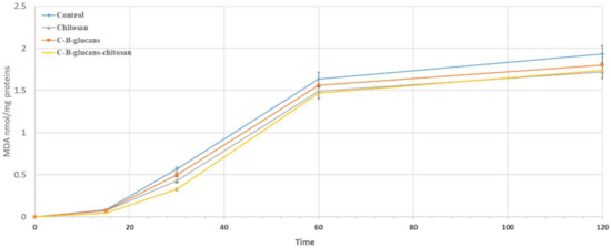 The ability of chitosan, C-β-glucans and C-β-glucans–chitosan membranes to inhibit lipid peroxidation, induced by a free radical generator such as tert-BOOH, was examined in rat liver microsomal membranes over 120 min of incubation. The ability of the synthesized materials to inhibit lipid peroxidation was shown to be time dependent. Results indicated that C-β-glucans and C-β-glucans–chitosan membranes showed the same antioxidant capacity of the chitosan membranes, with a slight protecting effect of microsomes from tert-BOOH-induced lipid peroxidation (Figure 7).