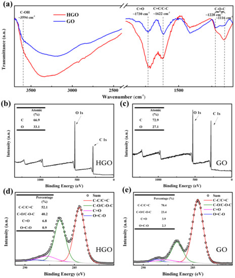(a) The normalized Fourier transform infrared (FTIR) spectroscopy of GO and HGO membranes. (b,c) The full-scan X-ray photoelectron spectroscopy (XPS) of HGO and GO; inset is the atomic percentage of C and O. (d,e) C1s XPS spectra of HGO and GO; inset is the proportion of oxygen-containing functional groups.