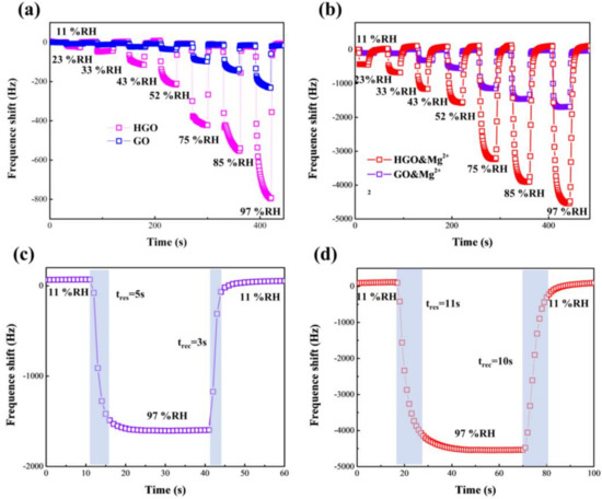 The response-frequency shifts (ΔF) of the GO- and HGO-based sensors with increasing RH levels in the range of 11–97% RH are shown in Figure 6a,b. It can be clearly found that the response, ΔF, of the two sensors both increase with increasing humidity. The maximum response, ΔF, of HGO- and GO-based sensors were 232 Hz and 793 Hz, respectively, in the relative humidity range from 11 to 97% RH. The response, ΔF, of the HGO-based sensor was greater than that of the GO-based sensor, suggesting that a smaller flake size and higher oxygen content are conducive to absorbing water molecules. This performance is consistent with that observed in previous works [34]. Moreover, the GO&Mg2+- and HGO&Mg2+-based sensors both exhibit significant strengthening in response, ΔF, compared with the GO- and HGO-based sensors. Although the response, ΔF, of the GO&Mg2+-based sensor (19.6 Hz/%RH) is not as high as that of the HGO&Mg2+-based sensor (52.7 Hz/%RH), the former still increased to approximately 10 times that of the original GO-based sensor. Because the size of GO flakes is too large and the oxygen-content is low, it is difficult for water molecules to enter the deep area when GO is not completely wet. Therefore, the interior of GO membranes may not be fully utilized. The introduction of Mg2+ increases the interlayer spacing of the GO and makes it easier for water to enter, while this has a relatively smaller effect on HGO. This is in agreement with the XRD results. In addition, the evenly distributed Mg2+ ions have a certain degree of hydrophilicity [35,36,37], which is also beneficial for improvement in the response, ΔF.