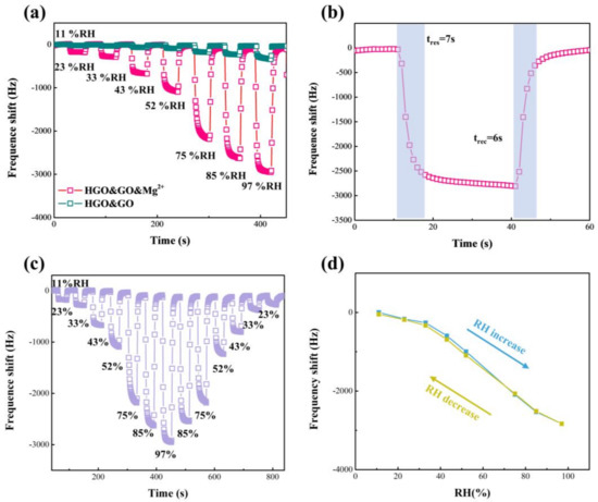 To assess the dynamic response performance of the sensors, the response and recovery times between 11% RH and 97% RH were also measured. Response and recovery time (tres and trec) in this work is defined as the time for the response, ΔF, to achieve 90% of the total ΔF amount between two different humidity levels, respectively, during the process of adsorption and desorption. As shown in Figure 6c,d, the GO&Mg2+-based sensor presents a shorter tres/trec (5 s/3 s) than the HGO&Mg2+-based sensor (11 s/10 s). The reason is that on one hand, the response, ΔF, of GO is relatively smaller, and on the other hand, the large area of sp2 hydrophobic channels in the GO membrane can help oxygen-containing groups and Mg2+ ions more quickly absorb and desorb water molecules [38,39,40]. Considering that the combination of HGO with Mg2+ can greatly improve the response-frequency shift and GO with Mg2+ can decrease response/recovery time of the QCM sensor, respectively, a more practical sensor may be prepared by combining HGO, GO and Mg2+.