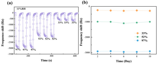 Stability and repeatability are two important criteria to measure the practical value of humidity-sensor performance. Figure 8a shows the repeatability of the HGO&GO&Mg2+-based sensor for different humidity levels: 11% to 33% RH and 52% to 97% RH. There is no clear variation in the response, ΔF, under the same humidity conversion conditions, suggesting that the HGO&GO&Mg2+-based sensor has excellent repeatability. In addition, as observed in Figure 8b, the response, ΔF of the HGO&GO&Mg2+-based sensor at three humidity levels (33% RH, 52% RH and 97% RH) was tested every two days for 10 days, and a minimal variation in the response, ΔF, appeared at different humidity levels. This obviously means that the HGO&GO&Mg2+-based sensor has good stability.