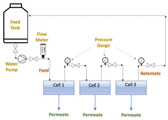 - Measurement of PWF in the inverted position: pre-compaction of new membrane coupons installed in the permeation cells under pure water pressure of 15 psig (1.0 bar) for 1 h, followed by a pure water permeation test at 5 psig (0.34 bar). For the permeation test, the permeate volume, V (L), collected during the period t (h) was measured, and the pure water flux PWF (L/m2·h) of the membrane was calculated bywhere A is the effective membrane area (2.04 × 10−3 m2). The average of the values obtained from the three permeation cells is reported.