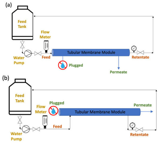 - Testing the ceramic UF membrane in the inverted position: the feed water flowed from the outer surface of the entire tubular ceramic membrane at 2 bar for 15 min in order to achieve flux stabilization. It was followed by reducing the pressure to 1 bar, and the permeate was collected multiple times for a period of 30 min to calculate the average permeate flux. The PWF of the membrane in both orientations was calculated based on Equation (1) as described for the PES UF membrane.