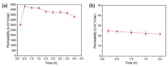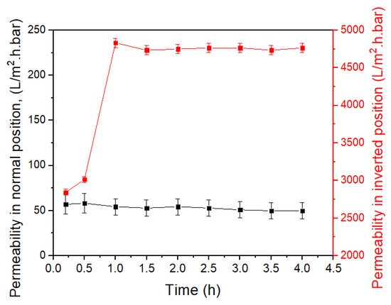 - UF testing with the PVPK90 solution in normal position and inverted position: the protocol was similar to that for the filtration of a BSA solution, except that the feed solution was replaced by a 250 mg/L PVPK90 solution. The permeate flux J was calculated using Equation (1) by replacing PWF with J. The PVPK90 concentration in the feed and permeate samples was measured using a total organic carbon (TOC) analyzer (OCT-L, Shimadzu, Japan). The PVPK90 rejection efficiency, R, was then calculated using Equation (2).