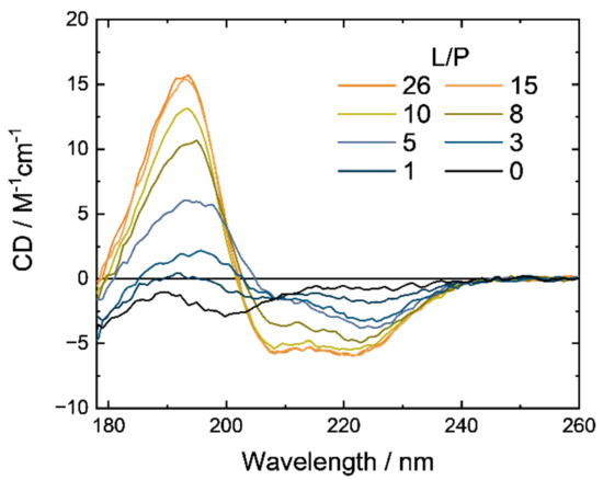 Synchrotron-radiation circular dichroism (SRCD) spectra of M2 in the presence of DPPG liposome in the L/P ratio from 0 to 26. All spectra were recorded at 25 °C, pH 7.0, and the M2 concentration of 300 μM. Experimental conditions are described in detail in Section 2.3.