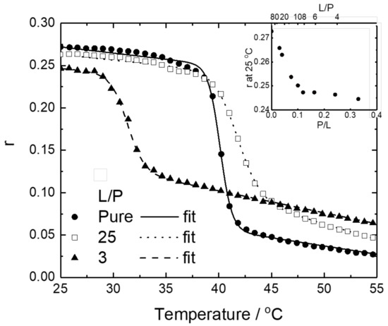 As shown in the inset of Figure 5, the r at 25 °C linearly decreased as L/P decreased, up to 10, whereas r did not change below a L/P of 10, implying that the effect of M2 binding on the DPPG membrane changes around L/P = 10. We analyzed the midpoint temperature Tm and the molar enthalpy change ΔH of the phase transition of DPPG liposomes in the presence of M2 using a sigmoid function (Equation (2)). The fitting curves were well fitted to the experimental data (Figure 5). The Tm and ΔH values are listed in Table 1. From this table, pure DPPG liposomes showed a phase-transition temperature (Tm) of approximately 40.1 °C, which is consistent with the main phase-transition temperature of the DPPG membrane (Tm = 41 °C), showing that the DPH fluorescence anisotropy measurement can successfully monitor the change in membrane fluidity of DPPG liposomes. The Tm of DPPG liposomes at a L/P = 25 was 41.7 °C, which was higher than that of pure DPPG liposomes. In contrast, the Tm of DPPG liposomes at L/P = 3 was 31.3 °C, showing a significant decrease. This indicates that M2 in the DPPG membranes at L/P = 3 destabilizes the bilayer structure of the membranes. Since M2 can form a monomeric helical structure and oligomeric strand structure at L/P = 25 and 3, respectively, these findings suggest that the adsorption of monomeric and oligomeric M2 on the DPPG membranes largely contributes to the stabilization and destabilization of the membrane, respectively.
