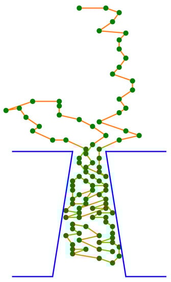 At this point, it is a good moment to report on yet another observation that is related to the previous one. This remark refers to the case where . In our research, this value of the outlet diameter was also taken into account. However, it turned out that for , within about of all such cases, the CLB gets stuck in the pore for good (we had to stop the simulations for computation time reasons). Moreover, in the remaining (i.e. successful) transitions, the passage time varied dramatically; from several thousands to millions of steps, indicating that very often the CLB was “almost stuck” in the pore. It is worth mentioning, here, that for the cylindrical pores with identical diameters the translocation time is the shortest one, when comparing with , which refers to pores with and , see Figure 7 and for other details refer to [48]. We see that the conical geometry of the pore is very significant in these cases. Recall that means that only two lattice-nodes are available for CLB segments while passing this opening. However, one of the assumed restrictions imposed on the CLB structures is , meaning that the shortest possible bond needs 3 available nodes. This fact can be the possible reason for such behaviors of the CLB while passing through the pore—if the pore is cylindrical, then no clustering of the CLB segments is possible, because the diameter is too small. Hence, the CLB moves always in a “head-to-tail” fashion. On the other hand, in the conical pores, if the diameter then the tempo of the segments that leave the pore is too small in comparison to the speed at which the further segments enter the opening with . As a consequence, the segments inside the pore tend to gather in big clusters that cannot move at all, as is seen in Figure 8. What is also interesting, for the conical pores with , no CLBs that are stuck in the pore have been observed clearly, suggesting that the relation between and plays an important role in the described phenomenon.