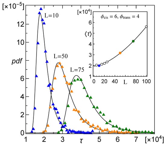 Empirical distributions of translocation time, , of a CLB with segments computed for increasing membrane thickness, L, and pore diameters . Solid lines follow Equation (2). The inset shows respective mean values . The sample size is .