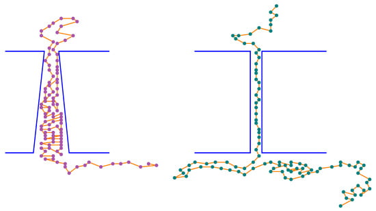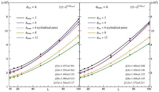 When comparing the mean translocation times displayed in Figure 5 for different arrangements of pore diameters, it is clearly seen that differs only slightly when the direction of translocation is reversed. Obviously, such a difference will grow if membrane thickness increases. This is because and L are related through Equation (5) and the estimated values of the corresponding exponents, , differ; see the data displayed in the left and right panels. When comparing values of for a given pair of , it is seen that referring to is smaller than that related to . Such a slowing-down appears when , because then the average speed of the segments that leave the pore is less than that at which the remaining segments enter the opening, so the segments tend to get grouped inside the pore.