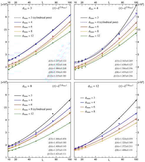 Additionally, Figure 7 displays corresponding to the CLB translocations through cylindrical pores of length . A part of this data was displayed in Figure 5 and Figure 6 as data points and respective dashed lines.