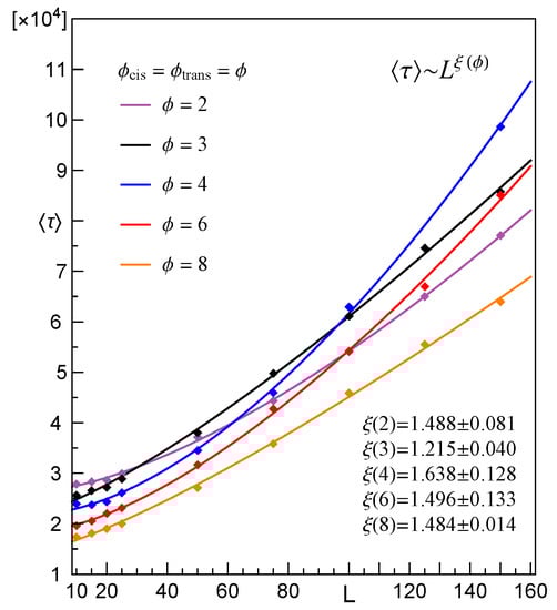 best fits the mean time, , spent by CLBs when they passed pores in membranes with growing thicknesses of L. The parameters and the index depend on and . An illustrative example of relation (5) is presented in Figure 4.