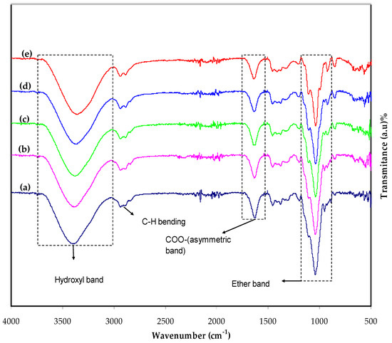The FTIR spectra of MC:KI films containing dissimilar concentrations of glycerol are shown in Figure 3. It is well-known that hydrogen bonding forces the frequencies of stretching vibration of the bonds; therefore, IR spectroscopy can be informative when studying MC-based electrolyte films [24]. In clean MC, the hydroxyl band lies in the wavenumber range of 3447–3458 cm−1; however, the range localizes between 1066 cm−1 and 1110 cm−1 [25]. The stretching vibrations of COO− (symmetric), COO− (asymmetric), C–H (aliphatic), and O–H are attributed to the bands at 1422, 1608, 2931, and 3420 cm−1 [26]. O–H stretching at 3458 cm−1 and C–H stretching at 2902 cm−1 are both absorption bands in pure MC. The C–O stretching from the asymmetric oxygen bridge at 1646 cm−1 is between 1065 and 1123 cm−1. Interestingly, the C–H bending of MC exhibits distinct small absorption bands in the 1251–1455 cm−1 range. Moreover, the C–H vibrations form small bands in the 487–654 cm−1 range [27].