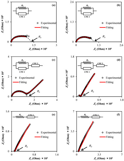 Furthermore, for the equivalent circuit (insets of Figure 4a), the real (Zr) and imaginary (Zi) values of complex impedance (Z*) can be stated according to the following mathematical equation [41]: