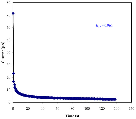 For Poly(methyl methacrylate) (PMMA): lithium triflate (LiCF3SO3), Othman, and co-workers [48] reported ti values ranging from 0.93 to 0.98. (LiCF3SO3). As a result, the large transference number may be linked to the microscopic parameter’s influence of polymer–ion and ion–ion interactions.