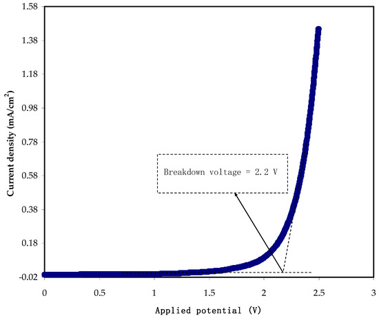 One of the requirements of polymer electrolytes to be utilized in energy storage devices is determining electrochemical potential stability. From the response of LSV, one can determine the decomposition potential of the conducting electrolyte, as shown in Figure 6. It can be seen that below 1.5 V, no recording of current, indicating no electrochemical decomposition of the electrolyte before this value of potential.