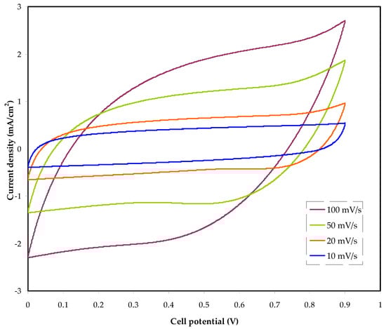 Figure 7 shows the cyclic voltammetry (CV) results for the constructed EDLC at various scan speeds. Potentiodynamic electrochemical measurement is used to determine CV. In this analytic approach, the electrode potential is determined linearly in relation to time. The electrode potential can also be shown as a function of time. The cyclic voltammogram trace shows the current versus the applied voltage concerning the working electrode [57]. The CV comeback is a leaf-like form, which is comparatively rectangular. This electrolyte system feature indicates the occurrence of a supercapacitor in EDLC assembly, which is appropriate for utilization.