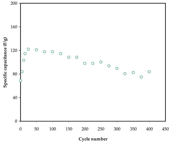The constant current is i, and the active material mass is m, which is the mass of active carbon. The change of specific capacitance, Cs, for the built EDLC up to 400 cycles is shown in Figure 9. The Cspe rises to 115 F g−1 in the fifth cycle and remains constant at 96 F g−1 until the 400th cycle.