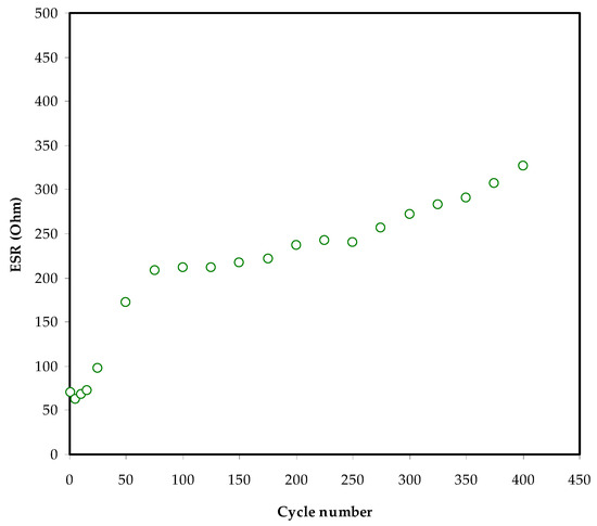 The Resr of the EDLC at 400 cycles is exhibited in Figure 10. The Resr varies from 70 to 310 Ω. It is worth noting that the weakening of the solid polymer electrolytes in the EDLC investigated by Kumar and Bhat [74] occurs owing to the boost in voltage drop during the charge–discharge cycle, which leads to an increase in ESR. When ESR is taken into account, the ionic liquid integrated with poly (ethylene oxide) (PEO)-based polymer electrolyte has a value of 1300 Ω [64], while the existing electrolyte has a value that is relatively low. Asmara et al. [75] recorded a low Resr value for compatible electrode–electrolyte contact, implying that ions move quickly from the electrolyte to the electrode surface, creating an electrical double-layer.