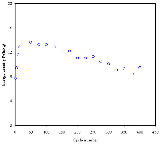 The energy density (Ed) for the assembled EDLC throughout 400 cycles.