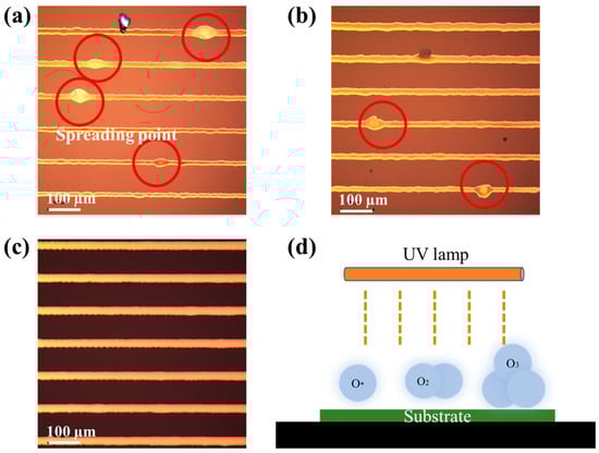 The relationships between surface treatment and processing time are shown in Figure S1. Surface treatment of glass substrates with ultraviolet light will change their physical and chemical properties []. For instance, UV irradiation will improve the wettability between the ink and the substrate because of decarbonization and the hydrophilic surface [,]. We can see from Figure S1 that with the increase of treatment time, both surface treatment methods could effectively reduce contact angle, and oxygen plasma was better than UV treatment in terms of wettability. Microscopic pictures of the printed line are shown in Figure 2. After surface treatment, silver lines could be directly printed on the substrates using EHD printing. The printability of the substrate without any treatment seemed to be the worst (Figure 2a) as silver ink diffused on the untreated substrate at random positions after printing. After UV treatment of the substrate, bulging points also appeared (Figure 2b). The substrate with oxygen plasma treatment had the best printing effect (Figure 2c). Oxygen plasma had better treatment results when compared with UV treatment, as it not only produced ultraviolet rays on the substrate, but also changed the substrate surface. With oxygen plasma treatment, a slight surface etch can be used for surface cleaning []. At the same time, the gas (O*, O3) activity in the chamber is high, which can effectively oxidize oil stains on the substrate surface (Figure 2d). Therefore, oxygen plasma treatment can reduce the unevenness of the substrate surface, thereby reducing the phenomenon of abnormal bulging. This approach could help to improve the uniformity of EHD printing.