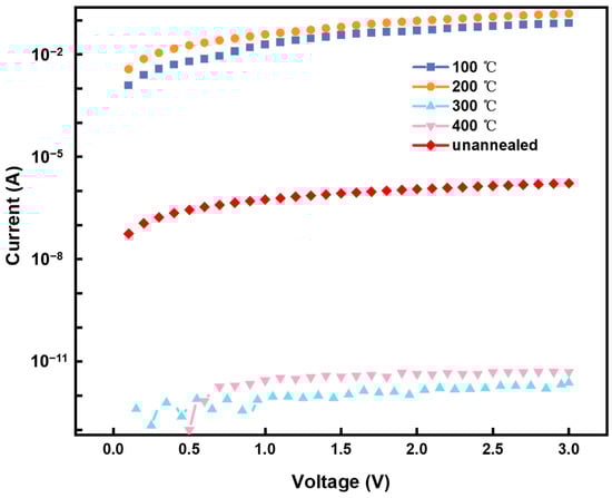 Figure 3 shows the relationship between annealing temperature and the conductivity of silver electrodes. Thermal annealing is an effective post-treatment technology that can be used for curing and sintering as-printed Ag electrodes [,]. As can be seen in Figure 3, the conductivity initially increased and then sharply decreased with increasing annealing temperature. From room temperature to 200 °C, the conductivity of the silver electrode was enhanced because the organic solvent evaporated, reducing the internal resistance. However, with the increase of annealing temperature, the internal defects of the electrode increased, resulting in a sharp decrease in conductivity. In order to prove that the internal defects led to the decrease of conductivity, the internal microstructure of the electrodes was observed with a scanning electron microscope.