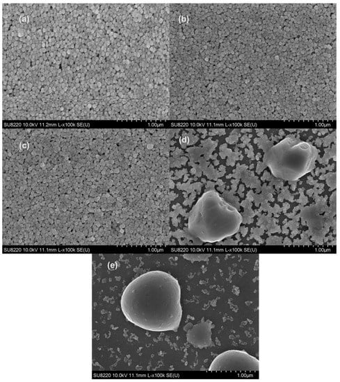 Figure 4 shows the microstructure of particles inside the silver electrode at different annealing temperatures. The microstructure inside the silver electrode will eventually affect its conductivity. As can be seen in Figure 4, the size of silver particles under annealing at room temperature, 100 °C, and 200 °C was about 80 nm, and they had a spherical shape. Meanwhile, the distribution of Ag particles on the surface was uniform (Figure 4a–c). The silver particles were not tightly packed because many channels were formed by solvent evaporation. Though the melting point of bulk Ag is around 962 °C, we observed that silver particles melted and began to agglomerate to form large particles at only 300 °C (Figure 4d), which can be attributed to the size effect of nanoparticles [,]. When the annealing temperature was further increased to 400 °C, the Ag nanoparticles grew to isolated large-size Ag particles (Figure 4e). With the increase of annealing temperature, the silver particles inside electrode melted and fused into isolated particles, causing the breakage of conductive channels in the Ag electrode. Finally, the conductivity dropped sharply because there was an insufficient conductive percolation network.