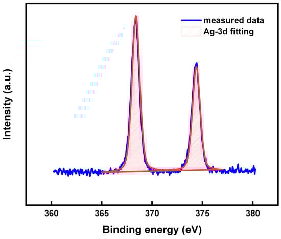 Figure 5 shows the Ag-3d XPS scanning spectrum and XPS spectrum fitting analysis after annealing at 200 °C. Through the use of X-ray photoelectron spectroscopy (XPS), widely used both in basic research and in materials analysis (particularly in surface analysis), important information can be obtained about the electronic structure of Ag elements []. Figure 5 shows Ag-3d narrow-scan XPS spectra at 200 °C annealing. It was found that the Ag-3d peak shapes of the samples were symmetrical and sharp without passivation and disproportionation. Meanwhile, the spin-splitting orbits of Ag-3d3/2 and Ag-3d5/2 are roughly at 6 eV, and for pure silver the atomic splitting orbital is also 6 eV []. Therefore, we can preliminarily determine that the sample was in an elemental state. After the fine-scanning peak of Ag was calibrated with charge, we determined that the fitting effect was good by fitting with the standard peak of elemental silver at 368.40 eV []. The results indicate that Ag nanoparticles can remain in an elemental state without oxidation due to low-temperature annealing. Therefore, we recommend the annealing temperature of 200 °C among the investigated annealing temperatures, which can be used in the solidification molding of EHD printing silver particle ink and obtain good conductivity.