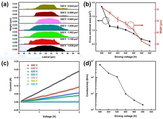 Profile morphology and electrical conductivity of EHD−printed silver electrodes: (a) Topography of cross−sectional area; (b) cross−sectional area and line width under different driving voltages; (c) volt–ampere curves under different driving voltages; (d) electrical conductivity under different driving voltages.