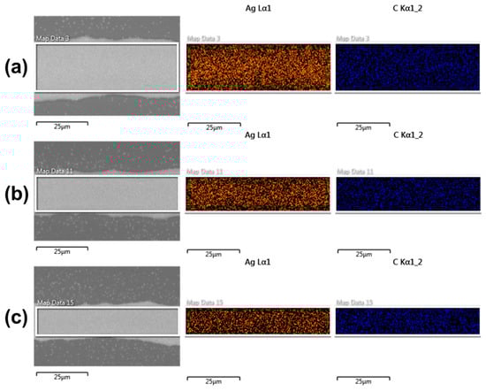Scanning electron microscope (SEM) images and element distributions (Ag and C) scanned by energy-dispersive X-ray spectrometry (EDS): (a) 660 V; (b) 600 V; (c) 540 V.