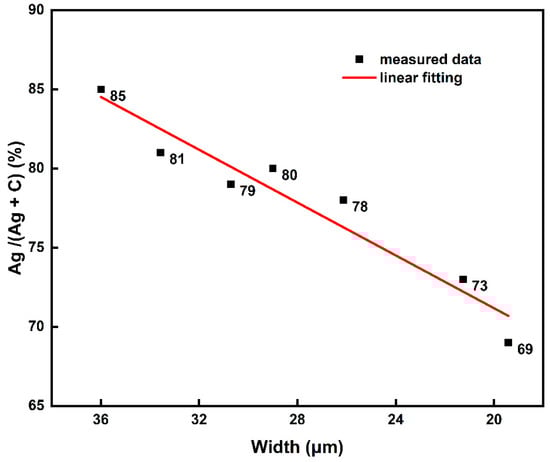 The mass percentages of Ag and C under different printing conditions were calculated. According to the test results, the change of Ag/(Ag + C) under different line widths was solved (Figure 8). With the decrease of driving voltage, the inkjet quantity decreased. Ink particles have metal characteristics; silver nanoparticles have high dielectric constant and high electrostatic force, while polymers have low dielectric constant and small electrostatic force. Compared with the electrostatic force of the polymers, silver nanoparticles are more sensitive to electric field change. Therefore, when the driving voltage decreases, the Ag/C ratio will decrease. The decrease of Ag/(Ag + C) ratio indicates that the increase of organic residual ratio in the printed silver electrode increased the internal resistance of the electrode, causing the electrical conductivity of the silver electrode to decrease. In summary, high-voltage printing (with higher inkjet volume) yielded a larger line width and had higher conductivity, while low-voltage printing had a smaller line width and provided higher-resolution characteristics. This provides a reference for the preparation of EHD-printed electrodes with high performance at low temperature in the future, for example, increasing the number of silver particles by using an ink with higher solids content or reducing organic matter in the electrode by using other sintering methods.