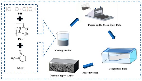 At a room temperature of 25 °C, the PSf, PVP, and NMP were mixed in the container in a 7:2:40 ratio for 24 h, and the resulting mixture was degassed for 12 h to produce a clear, homogeneous casting solution. The resulting mixture was scraped with the casting solution evenly on a clean glass plate, then placed in a water bath for phase conversion to obtain the porous support layer [], which was subsequently stored in DI water after it was removed from the water bath till later usage, as shown in Figure 1.