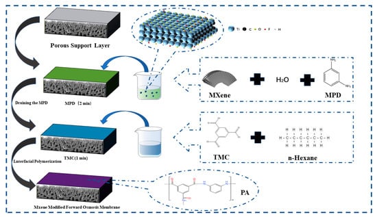 In this context, researchers began to explore new raw materials on a continual basis in the hope of compensating for the shortcomings of FO membranes by exploiting the properties of certain materials. So far, a huge number of new materials have been developed by human beings, which are suitable for preparing FO membranes and can significantly improve their performance [], such as TiO2 [], graphene [], carbon nanotube [], and other materials. In comparison with the original membrane, the modified membrane prepared by these materials showed improved hydrophilicity, thus alleviating the concentration polarization phenomenon and greatly improving the water flux in the meantime, promoting the development of FO technology. In recent years, two-dimensional transition metal carbide MXene nano-sheets [] have gradually entered people’s vision. Compared with the previously widely used nano materials, MXene nano-sheets are two-dimensional flake nano fillers with a high specific surface area, adjustable layer spacing, excellent chemical stability, and good thermal resistance [], and have shown good application performance in other separation membrane fields []. For example, Wang et al. used double-layer MXene nano-sheets as rigid components to prepare the support membrane by vacuum-assisted filtration, and it was found that the synthetic membrane had highly ordered nanochannels and only allowed specific molecules to pass through, and its penetration into water and organic matter reached an amazing 2300 and 5000 LMH bar−1, respectively []. Pandey et al. prepared the modified nanofiltration membrane by blending Ti3C2Tx with cellulose acetate in the phase conversion process. The results showed that the water flux of the composite membrane was as high as 256.85 LMH bar−1 []. In the research field of FO membranes, Alfahel et al. prepared a modified FO membrane by blending MXene and cellulose acetate (CA) by the phase conversion method, which aimed to study the FO membrane application in seawater desalination and wastewater treatment. It was found that the addition of MXene improved the membrane water flux and reverse solute flux at the same time, and the MXene modified membrane was better than the commercial membrane in anti-fouling ability []. Xing Wu et al. investigated the construction of an MXene intermediate layer between the nylon matrix and the PA layer and also studied the performance of the as-prepared membranes by adjusting the concentration of MXene and brushing times. The results showed that this method broke the well-known trade-off effect, increased membrane water flux while decreasing reverse solute flux, as well as significantly improved the permeability of ethanol []. It can be seen that the MXene nano-sheets had great potential in the direction of water treatment, but so far, there had been few systematic research on its application in the field of the thin-film composite FO membrane, which still demanded further exploration. At present, the thin-film composite FO membrane prepared by interfacial polymerization technology has been widely studied and applied because it can be flexibly regulated according to the requirements of membrane performance and has a wide range of applications []. Generally, the active selective layer is formed at the top of the porous support layer through interfacial polymerization. Therefore, the physical structure state and chemical element composition of the active selective layer play an important role in the separation efficiency of the FO membrane [,,].