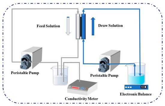 The FO membrane test equipment mainly included peristaltic pumps (Jie Heng, Chongqing, China), an electronic balance (APT456, Shenzhen, China), and a self-made membrane module (the effective area was 8.0 cm2) []. Because the FO membrane was asymmetric, different membrane orientations had a great impact on the results. Therefore, the membrane permeability and separation performance under the two modes of the active selective layer facing the draw solution (AL-DS mode) and the active layer facing the feed solution (AL-FS mode) were measured accordingly. The 1 M NaCl solution and pure water were selected as the draw solution and feed solution. As shown in Figure 3, the change in the weight of the draw solution during the FO process was recorded by the balance and the change in the conductivity on the feed solution side was recorded by the conductivity meter (Lei Ci, Shanghai, China).