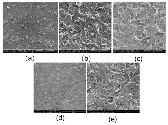 The SEM of the FO membranes with different amounts of MXene nano-sheet: (a) T-1, (b) T-2, (c) T-3, (d) T-4, and (e) T-5, respectively.