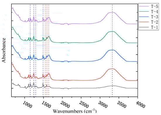 Figure 6 shows the test results of the Fourier infrared spectra of T-1 to T-5 membranes. It can be seen from the figure that there were a series of characteristic peaks, such as the symmetrical O=S=O peak (1148 cm−1), the symmetrical C-O-C peak (1240 cm−1), the asymmetric O=S=O peak (1295 cm−1), and the CH3-C-CH3 (1500 cm−1) peak of the PSf porous support membrane, indicating the smooth synthesis of a porous support layer. The obvious characteristic peaks were also observed at about 1600 cm−1, 1650 cm−1 and 1545 cm−1, which were attributed to the aromatic ring, amide I band (C=O), and amide II band (C-H) in the active selective layer, respectively. This confirmed again that the surface-active selective layer was successfully prepared on the surface of the porous support layer. In addition, in the range of 2000–4000 cm−1, it can be seen that the characteristic peak intensity of about 3300 cm−1 was significantly enhanced, which was due to the O-H bond vibration, indicating that the addition of MXene nano-sheets helped the FO surface form a more hydrophilic active selective layer [].