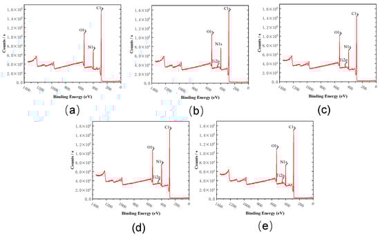 The XPS spectra of the surface of the FO membranes with different amounts of MXene nano-sheet: (a) T-1, (b) T-2, (c) T-3, (d) T-4, and (e) T-5, respectively.