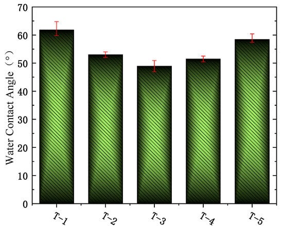 Figure 8 shows the effects of different MXene nano-sheets’ additions on the water contact angle of the FO membrane. It can be seen from the figure that the water contact angles of T-1 to T-5 membrane surfaces were 61.7°, 53.02°, 48.92°, 51.49°, and 58.43°, respectively. Due to the hydrophilic characteristics of MXene nano-sheets, they had an obvious positive effect on the improvement of membrane surface hydrophilicity. With the addition of MXene nano-sheets, the water contact angle of the surface-active selective layer of the FO membrane decreased first and then increased, and its water contact angle was lower than that of the unmodified FO membrane, which showed that the FO membrane generated a more hydrophilic surface due to the addition of MXene nano-sheets. On the one hand, the MXene nano-sheets contained a large number of O-H bonds of hydrophilic groups. Through the method of introducing them into the aqueous phase, the MXene nano-sheets can directly participate in the crosslinking reaction between the aqueous phase and the organic phase, thus affecting the polyamide structure of the active selective layer to the greatest extent, generating a more hydrophilic surface-active selective layer and improving the hydrophilicity of the prepared FO membrane. On the other hand, a large number of hydrophilic functional groups (C=O and N-H) rich in MXene nano-sheets were directly attached to the surface of the active selective layer, making the surface of the FO membrane highly hydrophilic []. However, with the continuous increase of MXene nanosheets, the contact angle increased and the hydrophilicity decreased in the figure, which may be due to the agglomeration of excessive MXene nano-sheets, resulting in the reduction of hydrophilic groups and the destruction of the surface structure of the active selective layer.