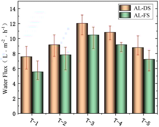 Water flux (Jw), reverse solute flux (Js), and specific reverse solute flux (FS) were used as FO membrane test indicators []. The higher the water flux, the better the permeability of the membrane. The interception performance of the membrane depends on the reverse solute flux. The smaller the reverse solute flux, the better the interception effect of the membrane. The specific reverse solute flux was a comprehensive index to measure the selectivity of the membrane, and the lower its value, the better the overall separation performance of the membrane.