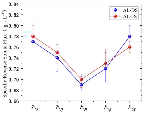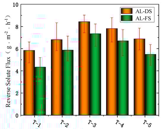 Figure 10 shows that as the amount of MXene nano-sheet added increased, the reverse solute flux of the modified FO membrane increased and then decreased slightly. When no MXene nano-sheets were added, the reverse solute flux of the prepared FO membrane was 5.85 g·m−2·h−1 (AL-DS mode) and 4.33 g·m−2·h−1 (AL-FS mode), and when the addition amount was 0.005%, the reverse solute flux of the prepared FO membrane was 6.81 g·m−2·h−1 (AL-DS mode) and 5.87 g·m−2·h−1 (AL-FS mode). At this moment, it shows an upward trend. When the addition amount was 0.007%, the reverse solute flux of the prepared FO membrane was 8.43 g·m−2·h−1 (AL-DS mode) and 7.34 g·m−2·h−1 (AL-FS mode), and it reached the maximum of these groups of experiments. When the addition amount continued to increase to 0.01%, the reverse solute flux of the prepared FO membrane was 7.81 g·m−2·h−1 (AL-DS mode) and 6.71 g·m−2·h−1 (AL-FS mode). At this time, the reverse solute flux showed a slight downward trend. When the addition amount reached 0.03%, the reverse solute flux of the prepared FO membrane decreased to 6.88 g·m−2·h−1 (AL-DS mode) and 5.49 g·m−2·h−1 (AL-FS mode) finally. It can be seen that the reverse solute flux of the FO membrane modified by MXene nano-sheets was higher than that of the unmodified FO membrane. The highest reverse solute flux reached 8.43 g·m−2·h−1 (AL-DS mode) and 7.34 g·m−2·h−1 (AL-FS mode) when the addition of MXene nano-sheets was 0.007%. The addition of MXene nano-sheets also changed the membrane structure of the active selective layer. The MXene nano-sheets added to the aqueous phase can increase the reverse solute flux, and the reverse solute flux of the modified FO membrane was slightly higher than that of the unmodified FO membrane. According to the permeability of the FO membrane and the above physical and chemical characterization, this was mainly due to the swelling effect produced by the MXene nano-sheets themselves [,]. When the Na+ ions in the draw solution pass through the channel formed by the MXene nano-sheets, the Na+ ions were quickly intercalated into the MXene nano-sheets layer. At the same time, with the electrostatic interaction between Na+ ions and negatively charged MXene nano-sheets, the layer spacing of MXene nano-sheets was expanded and the formed nanochannel was widened. As a result, Na+ ions can pass through quickly without obstruction. Moreover, Na+ ions can directly enter the active selective layer and make contact with MXene nano-sheets, and the swelling effect was more obvious because the MXene nano-sheets were distributed in the active selective layer, so the increase in reverse solute flux was greater. When the MXene nano-sheets continued to be added (0.01−0.03%), at that time, due to the agglomeration of some MXene nano-sheets and the reduction of nano-channels, the swelling effect tended to be gentle, and the membrane pores in the active selective layer were blocked, so the reverse solute flux showed a downward trend.