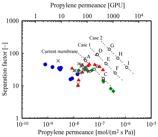This figure is also known as the Robeson plot and is commonly used in studies of the relationship between the permeance and selectivity of membranes [30]. For example, silica membranes (green) have a relatively high propylene permeance with a low separation factor compared to MOF membranes (MOF is represented by gray crosses in Figure 1). The permeance and separation factor affect the membrane area and energy consumption, respectively. Simply, a separation process using a membrane with high permeance requires a small area of a membrane. A separation process using a membrane with a high separation factor consumes a small amount of energy. Membranes with high permeance and separation factors are desirable. However, it is difficult to develop a membrane with both merits. In this study, the propylene permeance and separation factor of the recently developed membranes indicated with the dashed line in the Figure 1 are employed for the design and evaluation (hereafter referred to as “current membrane”). Moreover, the membrane separation performances were assumed to be constant with respect to the operation pressure. In this membrane category, three levels of separation performance were defined: (A) high separation factor with low permeance; (B) intermediate separation factor and permeance; and (C) low separation factor with high permeance. In addition to the above current membrane, two hypothetical categories of separation performances from emerging innovation (Cases 1 and 2) were investigated. The details of Cases 1 and 2 are described in Section 3.2. Note that the combinations are limited to the same membrane category (e.g., A and B; E and F); those between different membrane categories (e.g., A and D; B and H) were not investigated. The separation performances of the membranes used in the calculation are summarized in Figure 1 and Table 1.
