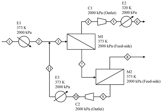 Schematic of the membrane-separation process. E: heat exchanger, M: membrane unit, C: compressor.