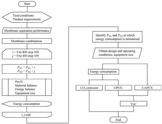 Figure 3 shows the design and evaluation scheme of the separation process. First, the feed conditions and product requirements were selected (Table 2). The membrane combinations were constructed based on the membrane-separation performances (Table 1). A process simulation was conducted using Pro/II to determine the permeate-side pressure of M1 and M2 at the lowest energy consumption. The initial value of the permeate-side pressure of M1 (PM1) and M2 (PM2) was 200 kPa, which were increased 9 and 5 times, respectively, with a step size of 100 kPa. Thus, 45 times calculations were conducted. Next, the design and operating conditions were obtained at PM1 and PM2 when the energy consumption was minimized. The CO2 emissions were calculated based on the energy consumption. The operation expenditure (OPEX) was calculated based on the energy consumption; the capital expenditure (CAPEX) was calculated based on the design conditions and equipment size. Subsequently, the areas of the M1 and M2 membranes were simply identified using PM1 and PM2 when the fixed feed conditions and the product requirements were set as the membrane-separation performances. TAC was calculated based on OPEX and CAPEX, and TAC with carbon tax was calculated based on the carbon price and TAC.