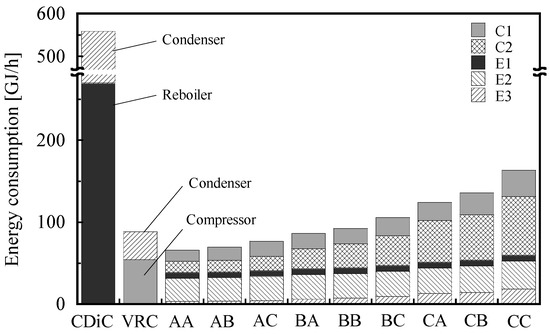 Energy consumptions of the two-stage membrane process with various combinations. C1 and C2 are compressors. The compressor duties are converted to primary energy. E1 is a heater; E2 and E3 are coolers. The energy consumption of CDiC includes the condenser and reboiler duties. The energy consumption of VRC includes the condenser and compressor duties.